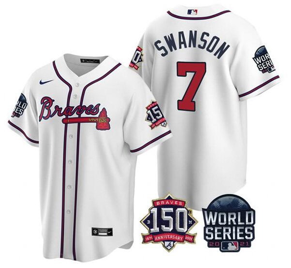 Men Atlanta Braves 7 Dansby Swanson 2021 White World Series With 150th Anniversary Patch Cool Base Stitched Jersey